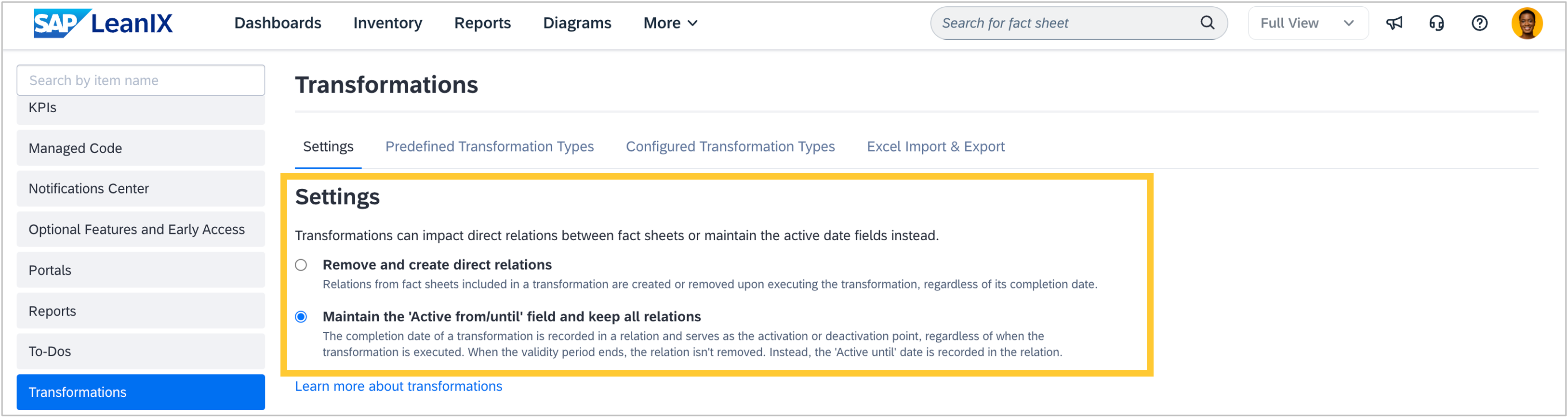 Understanding how your IT landscape has evolved — and where it is headed — requires data that reflects both past and future states. As a step towards that, we are giving you access to past relation data by streamlining the approach how relations are updated during transformations: In workspaces with SAP LeanIX Architecture and Road Map Planning, every relation within a transformation will carry a validity period instead of being silently removed when a transformation runs, preserving past, present, and future states across inventory, reports, and APIs. This update covers relations only. In the future, certain field types will also become time-aware — we will keep you informed when that time comes.
