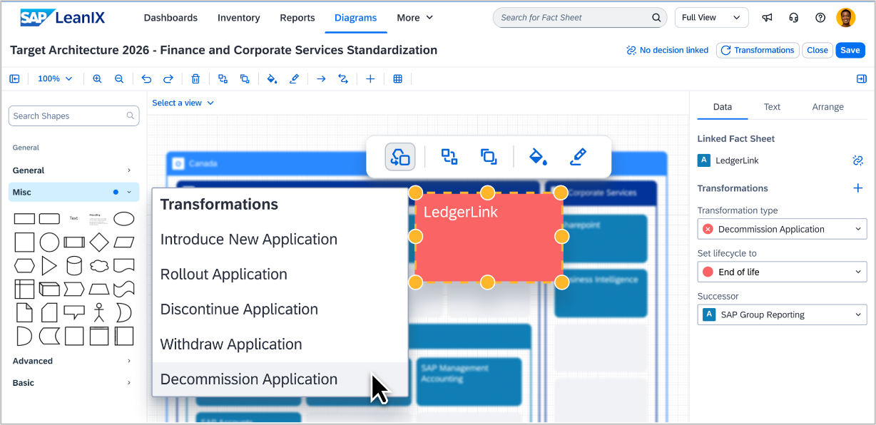 Transformations created in your diagrams automatically flow into the transformation explorer, where you can manage all planned changes across initiatives, move transformations between initiatives, set milestones, and navigate directly to roadmap views. The roadmap report gains visual milestone editing, so you can adjust your transformation milestones without leaving the report.