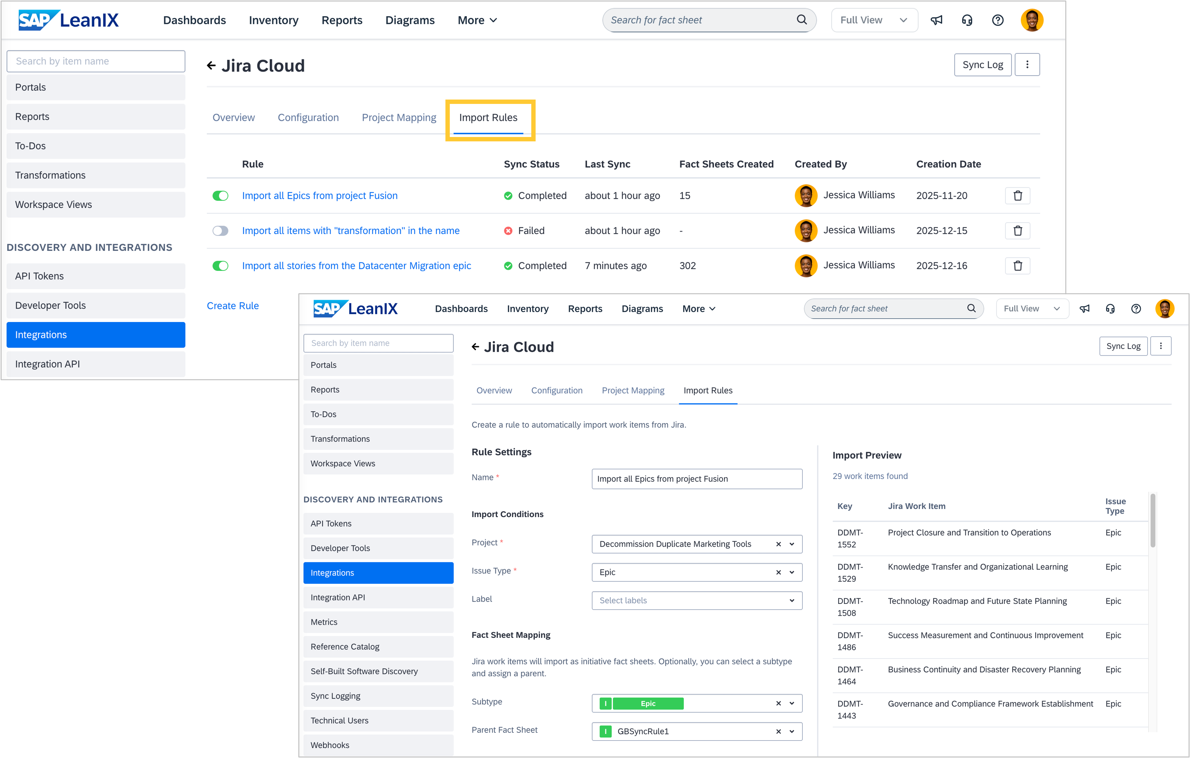 Additionally, you can now set up automated import rules in the admin area, to define which work items to import, how they should appear in your inventory and then conduct a bulk import. To filter import items, you can select Jira projects, issue types (for example, epic or story), and Jira labels. You can also define whether the imported work items should be created as a subtype or a child fact sheet of a certain parent initiative. Jira work items matching these rules will be automatically synced once the rules are saved and regularly updated in a nightly sync run. This leads to reduced maintenance effort, increased data completeness, and consequently greater trust in your data.