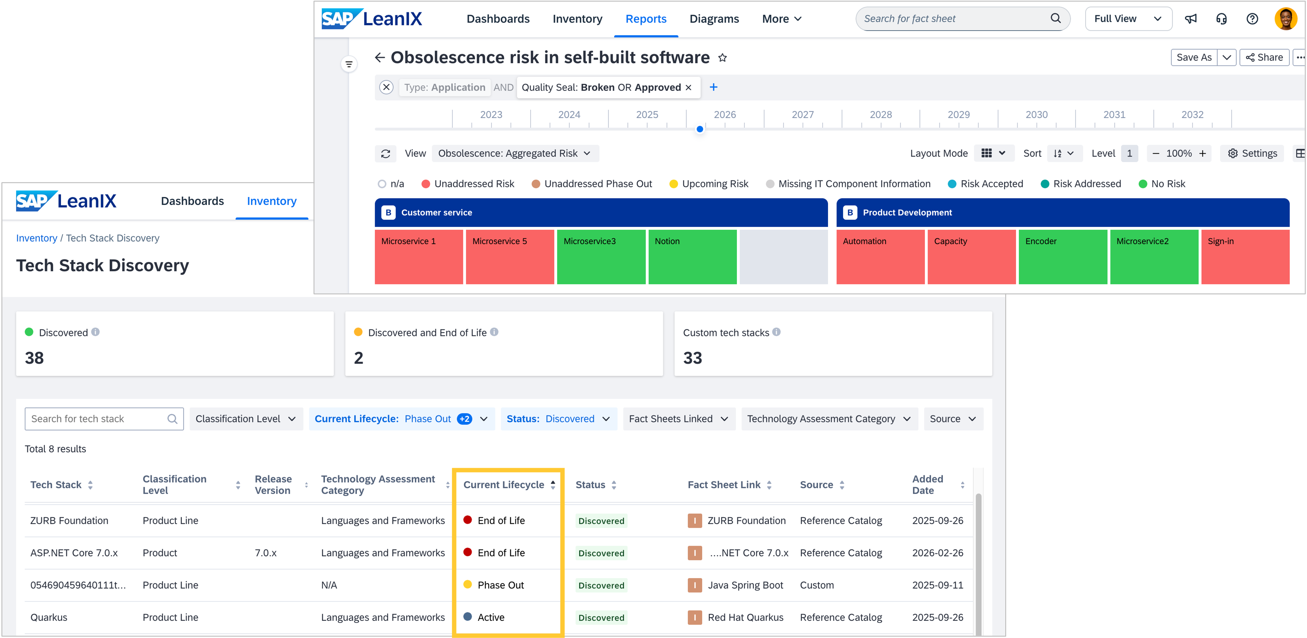 For workspaces with SAP LeanIX Technology Risk and Compliance, when you discover tech stacks (languages and frameworks) from your SBOMs, we now automatically look for tech stack versions (e.g., "Spring Boot 3.5") and match them against the reference catalog to surface end-of-support dates. In case you use custom or proprietary frameworks within your organisation, you can now define your own tech stack versions, add lifecycle data, and specify purl matching rules for incoming purls, getting the same governance visibility as open-source frameworks. The result is an accurate, version-level tech debt discovery and obsolescence risk aggregation for self-built applications with zero manual work.