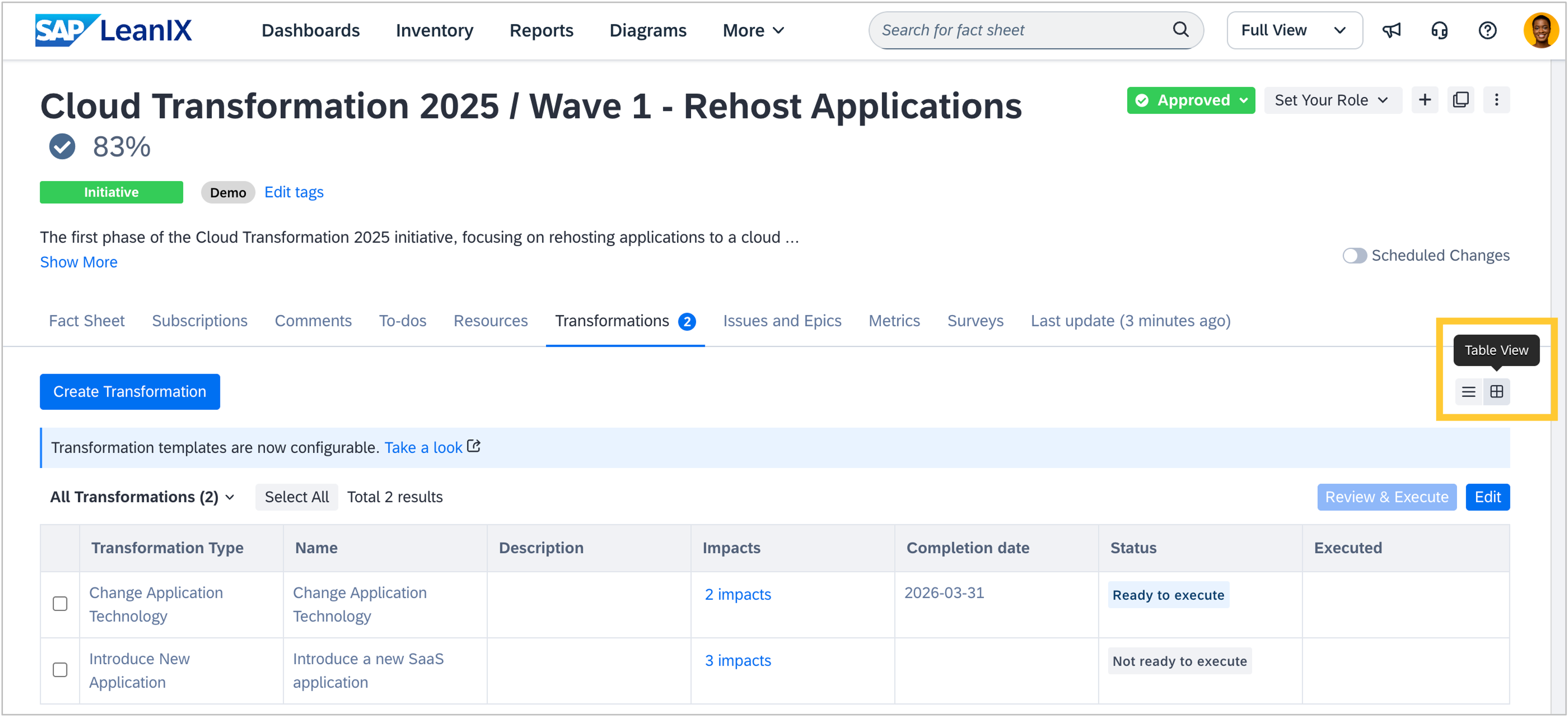 In workspaces with SAP LeanIX Architecture and Road Map Planning, when navigating to the transformations tab on an initiative fact sheet, the transformations can be displayed in either a list view or a table view. While the list view provides a detailed view of a transformation, the table view allows you to view and edit transformations at scale. This can be beneficial if you want to bulk edit completion dates of different transformations due to changed timelines. On the initiative fact sheets, the table view is now set as the default view, as a single initiative often includes multiple transformations. The default changes once you switch between list and table view. On other fact sheet types, the list view remains the only available view for now.