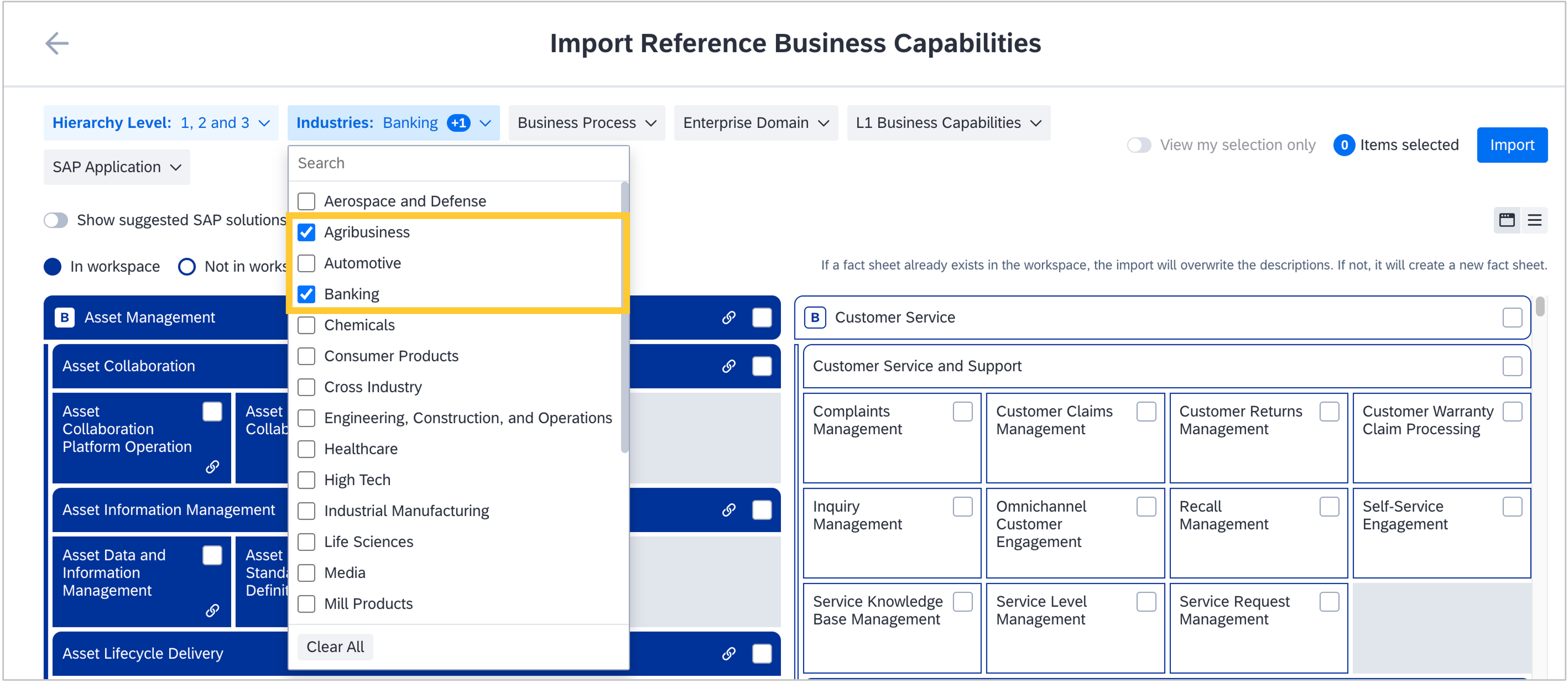 The most recent best-practice business capabilities are now available in the reference catalog. This update introduces two additional industries, banking and agribusiness, along with their respective business capabilities and suggested SAP solutions. To leverage the new best practices, import the business capabilities from the reference catalog. Business capability fact sheets, which already have an existing link to a catalog entry, can be updated as described here.