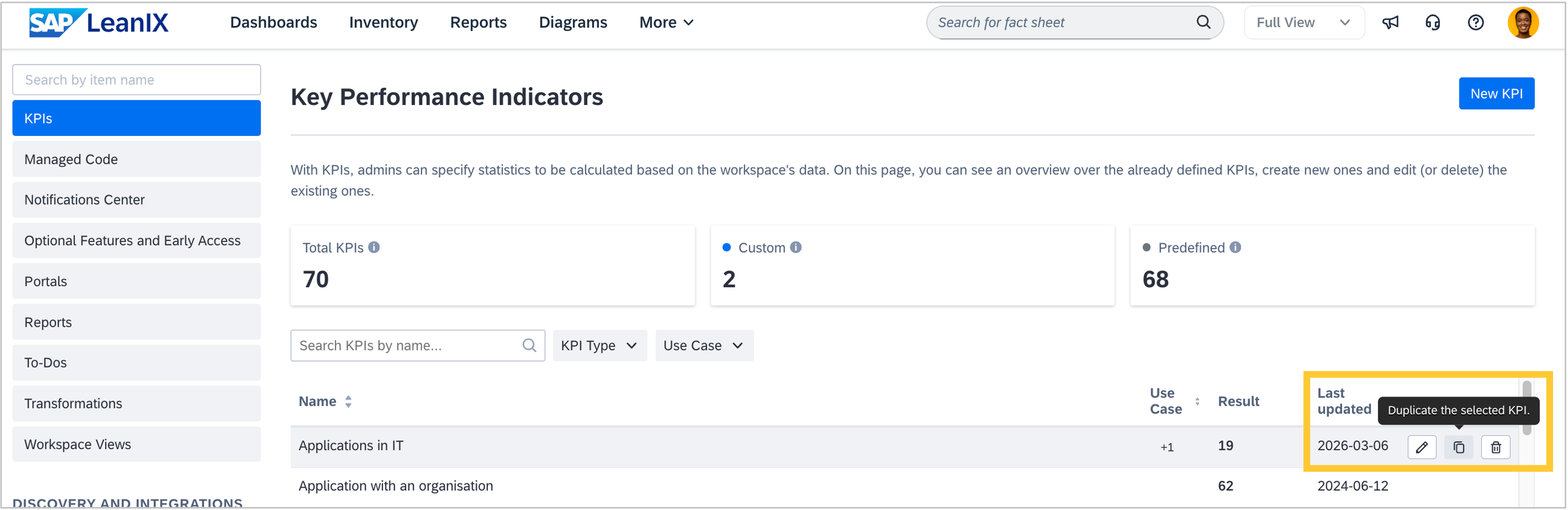 When defining KPIs as an admin, you can now duplicate custom KPIs from the list of available KPIs. In the row context menu for any custom KPI, the duplicate action creates a full copy of the KPI’s configuration — including its description, mode, aggregation type, and all filters — and opens it for editing before saving. This makes it quick to create variations of existing KPIs without having to rebuild them from scratch, and adds to the recent improvements to creating and managing KPIs.