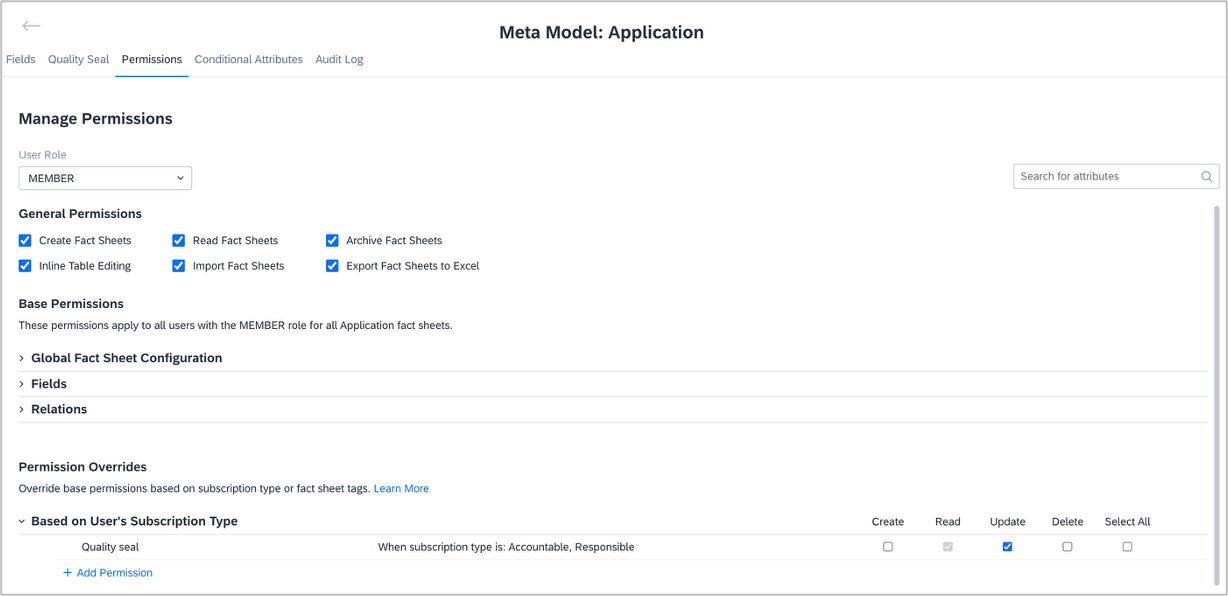 For admins, we have redesigned the fact sheet permissions page in the meta model configuration. Standard and advanced permissions are now organized into two distinct groups, making it easier for admins to distinguish between role-based permissions and those tied to subscription types or tags. Advanced permissions now display more detail about their conditions, so you can see at a glance when and why additional access is granted. The configuration flow for subscription-type permissions has also been updated to reflect the full granularity level, enabling both bulk operations and more precise control over individual permission rules.