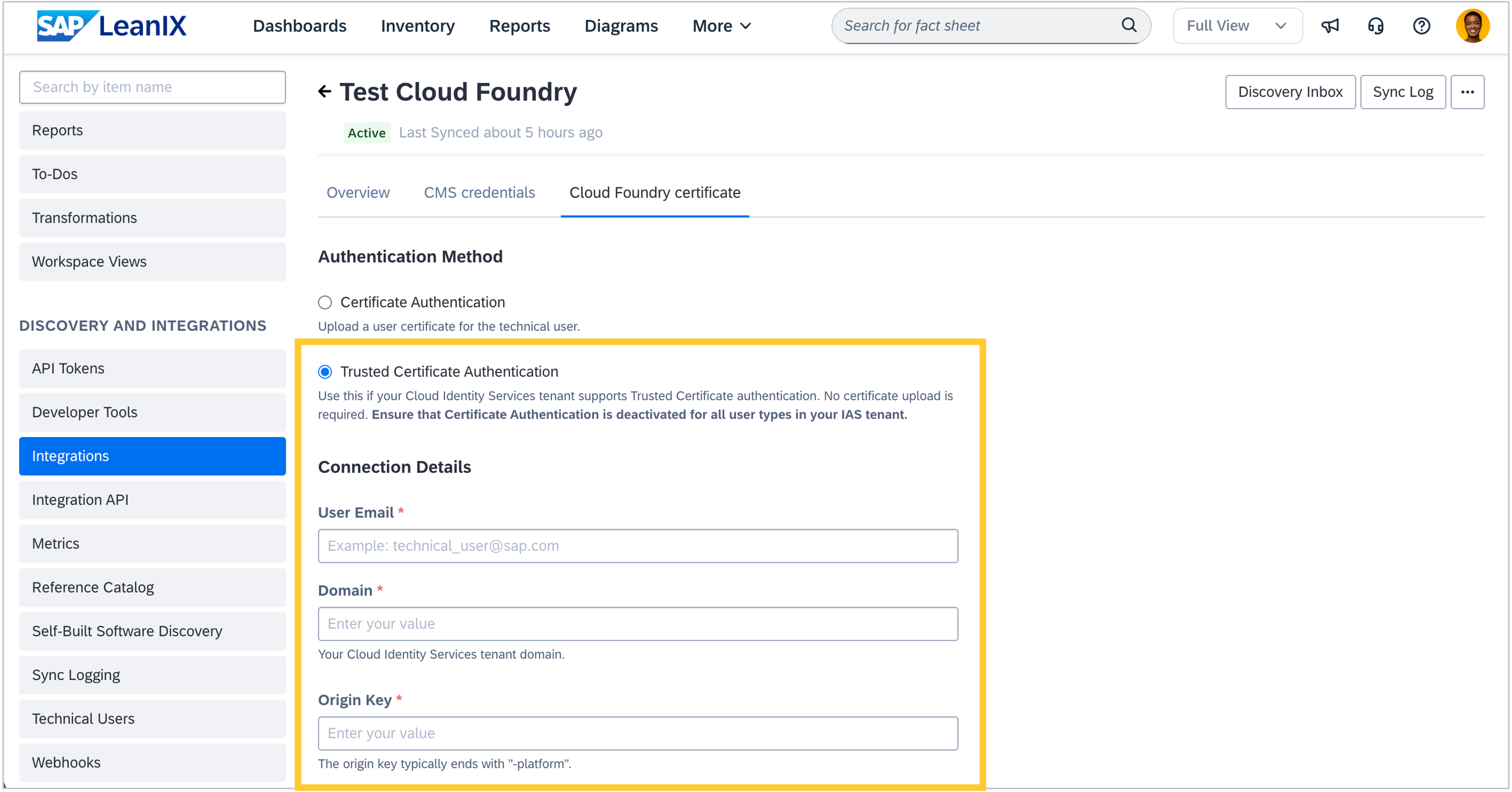 Within SAP discovery, we added an alternative way for admins to connect your workspace to your Cloud Foundry environment, now supporting trusted certificate authentication. Instead of generating, downloading, and uploading a P12 certificate file with a password, you can now configure authentication using X.509 certificate patterns matched through SAP Cloud Identity Services (IAS). This eliminates the need to manage certificate files and passwords entirely: We generate a certificate pattern that you simply paste into your IAS trusted certificate configuration. The result is a more secure, streamlined setup with no credentials to store or rotate. For detailed configuration steps, see the SAP Help Portal.