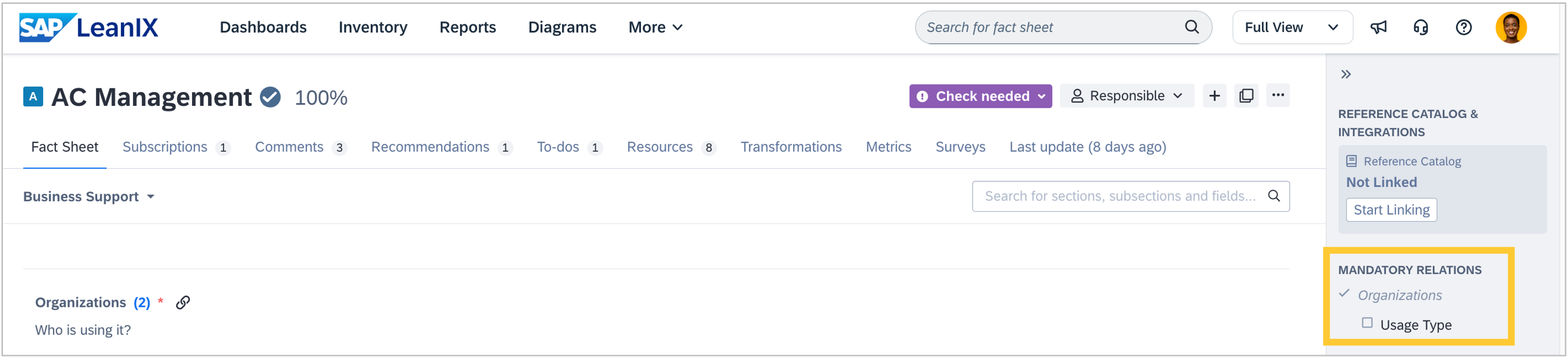 Admins can now make fields on relations mandatory attributes, meaning they must be filled before a fact sheet’s quality seal can be approved. For example, you can make the Support Type field mandatory on the relation between an application and a business capability, or require the Usage Type field on the relation between an application and an organisation to be filled in. This gives you more granular control over the data required by your quality definitions.