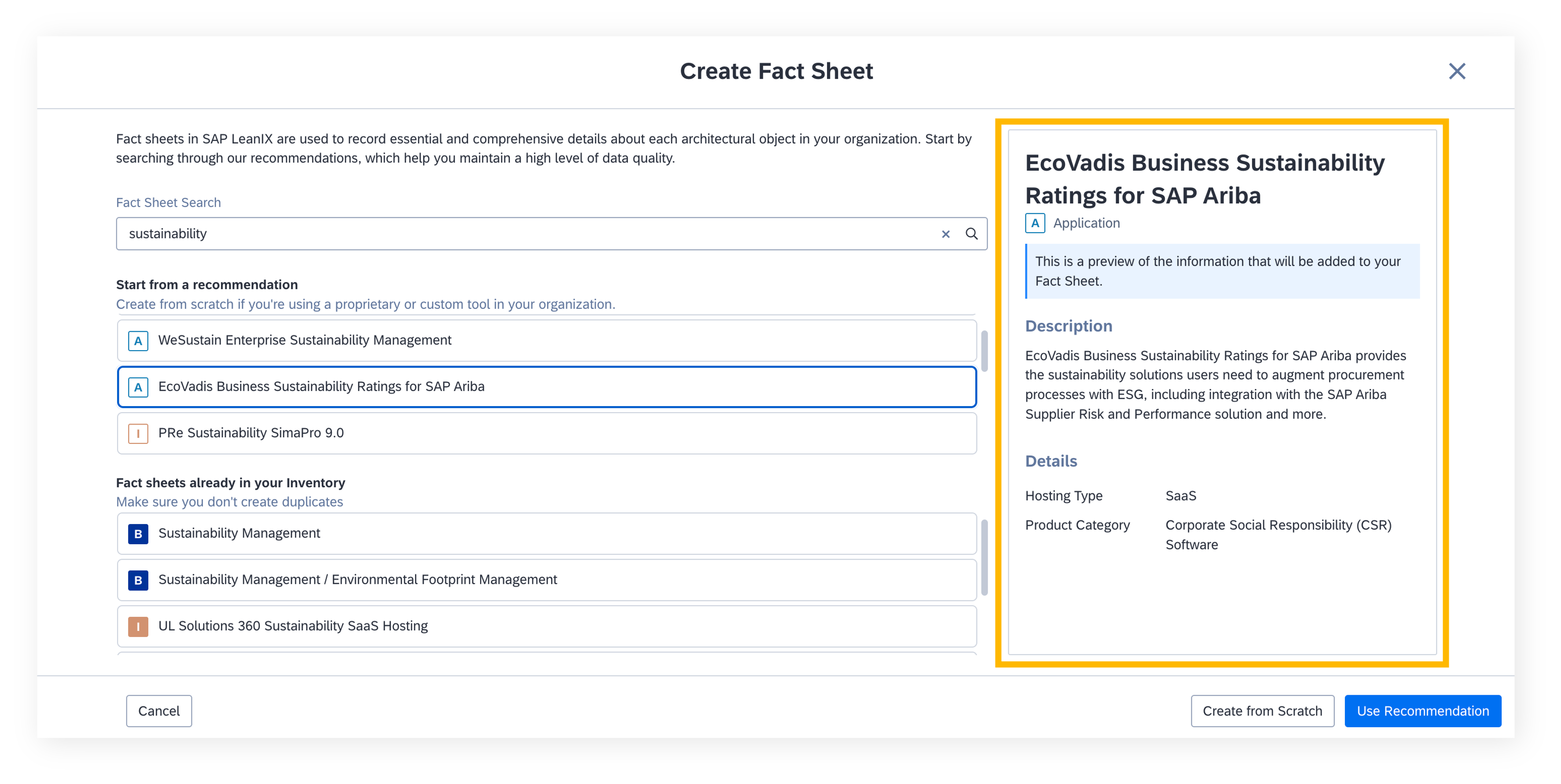 In the second step, after choosing a recommended reference item, a preview of the suggested fact sheet data helps to confirm the choice. If mandatory subscriptions are configured for the given fact sheet type, this step requires creators to fill in the subscribers to identify the stakeholders in your organization who can provide the baseline information on the new fact sheet later. Having the subscribers defined right from the beginning will benefit multiple capabilities and use cases of SAP LeanIX, like leveraging surveys.