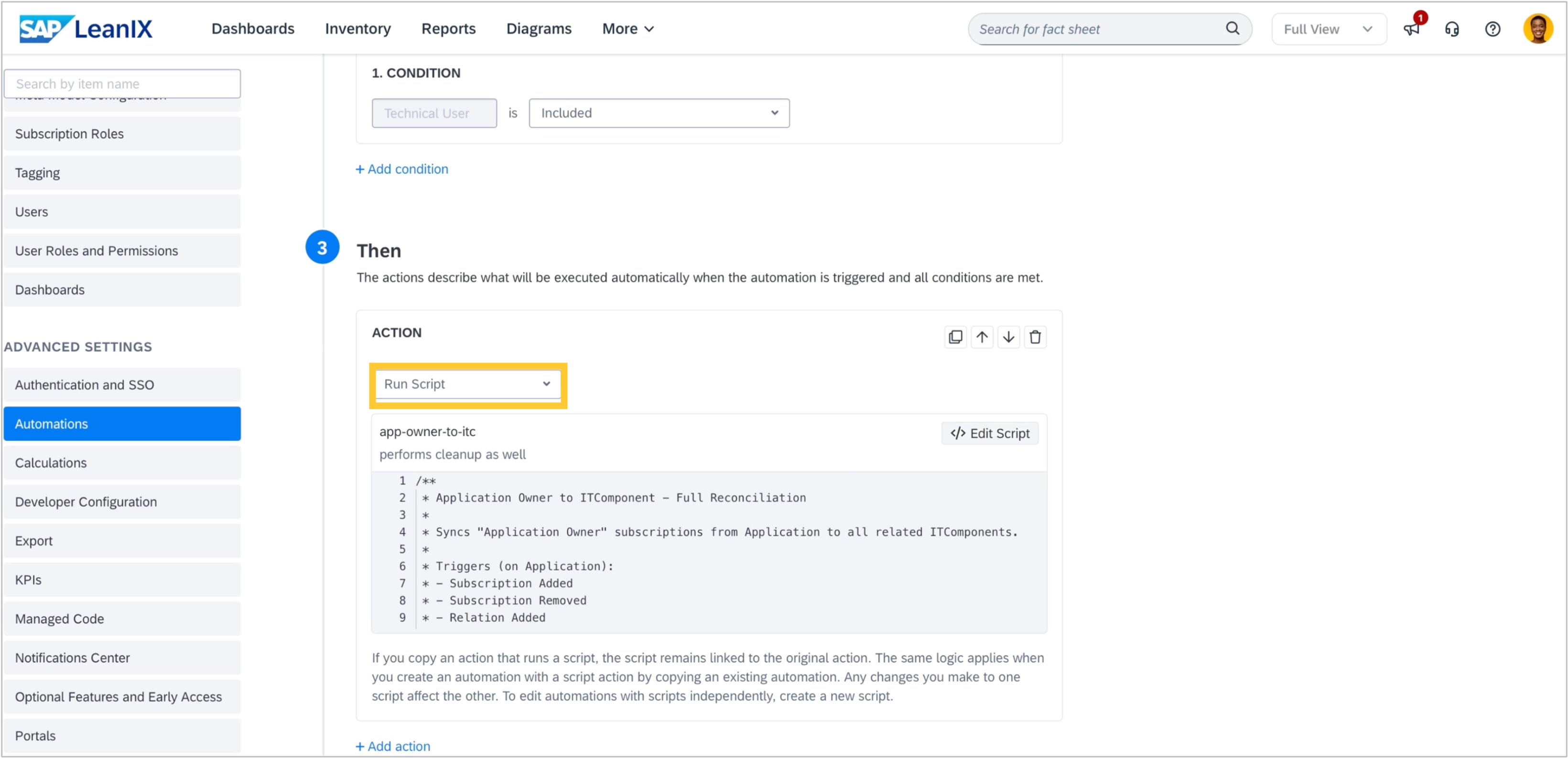 Secondly, you can now configure scripts that call the SAP LeanIX APIs to perform actions within automations. This allows you to configure simple or cascaded automation scenarios, reducing manual effort. It eliminates the need for third-party solutions, as the scripts run in a secure environment within SAP LeanIX.
