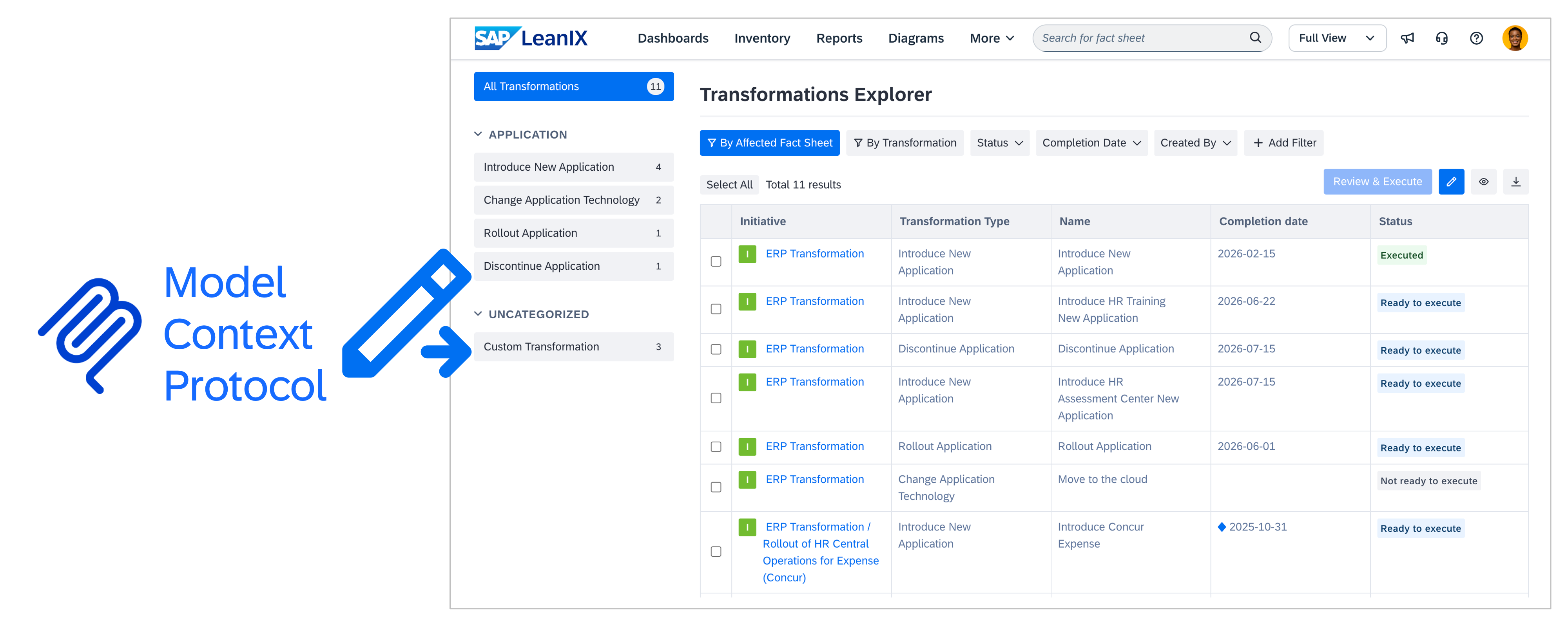 With the launch of the SAP LeanIX MCP server, we included a range of toolsets that enable AI agents to interact with your workspace data. This includes searching for transformations, understanding different transformation types, and displaying milestones. By the end of Q1, we plan to include initial write capabilities in the MCP server's toolset. This will enable you to utilize the MCP server to create transformations, initiatives, and milestones. It will also serve as an enabler for the AI-assisted Architecture Guidance roadmap item.