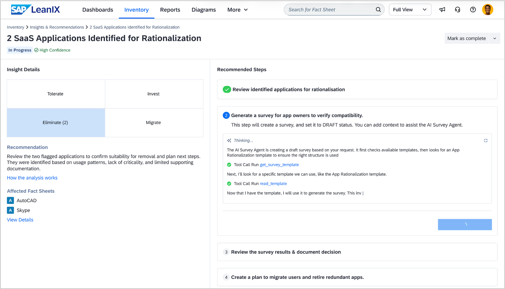 In today's fast-paced business environment, continually analyzing your IT landscape to identify opportunities for improvement is essential for optimizing your enterprise architecture, driving cost efficiency, and mitigating technical debt. While gathering detailed information is crucial, we're elevating our capabilities by providing AI-driven insights and recommendations to enhance your IT landscape analysis.