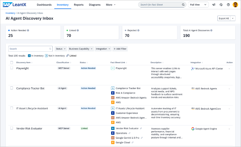 By linking MCP servers and AI agents to applications and to each other, you gain a holistic view of connections and dependencies of AI-related components in your enterprise architecture landscape. This approach helps identify additional optimization opportunities, such as building agent chains, and promotes the reuse of existing tools. Over the coming quarters, we plan to add more MCP server information to our reference catalog to further support the discovery and management of MCP servers. Furthermore, we are exploring Databricks and ServiceNow as additional sources for AI agents.