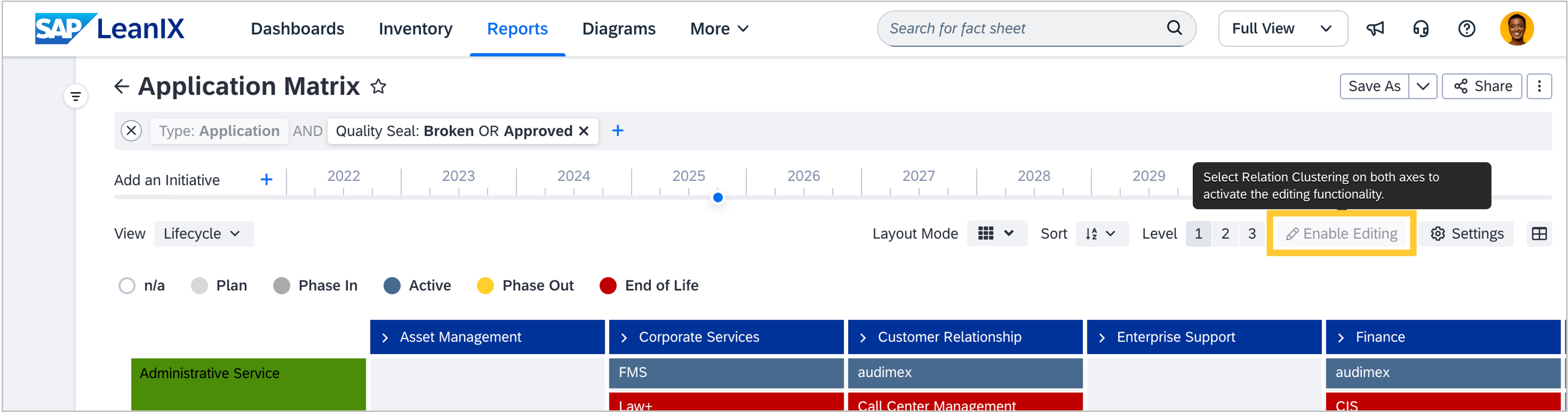 Instead of disappearing, the "Enable Editing" button on matrix reports is now disabled, and a tooltip appears when hovering the button, informing that this option is only available when both axes are fact sheet types, not fields or tags. This is because adding or removing a fact sheet represents editing the relation between two fact sheets that must be present on the axis. Fields and tags remain editable in the report's side panel.