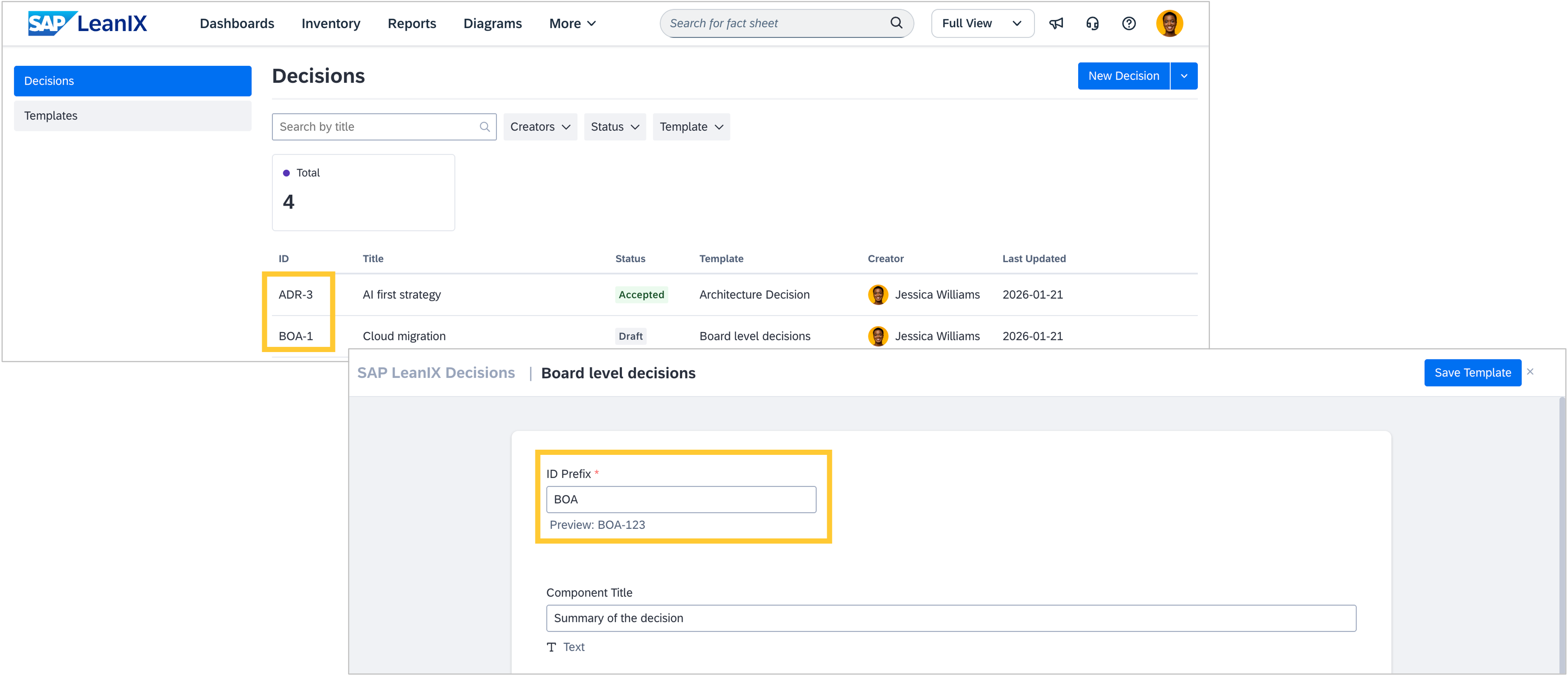 We introduced unique identifiers (IDs) for architecture decisions for clear cross-tool referencing. This makes it easier to reference, discuss, and track decisions across your organisation. Admins can set letter-based unique prefixes for each decision template, and an incremental number is automatically added to every new decision (e.g., ADR-42; BOA-23). Once generated, IDs remain stable, providing a reliable way to link to decisions from external tools like Confluence, Slack, or code repositories. The ID appears in lists and headers and can be used in conjunction with the decision's unique URL.