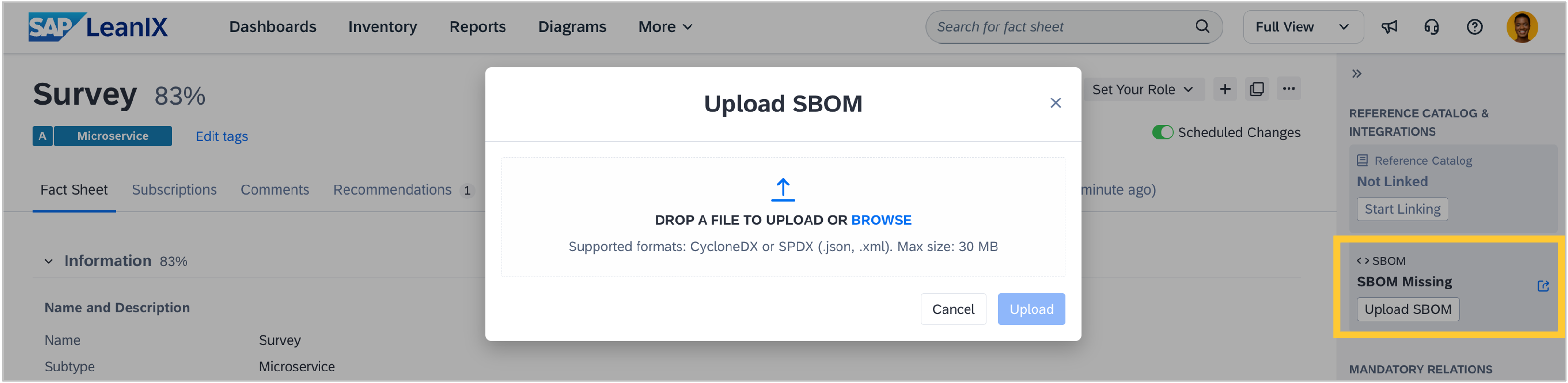 You can now manually upload SBOM files to microservice fact sheets. If a microservice is not yet connected to an automated discovery pipeline, you can upload a CycloneDX or SPDX file directly from the fact sheet sidebar to populate its software components. This is especially useful for legacy services, vendor-managed applications, or when you need immediate SBOM coverage for compliance purposes.