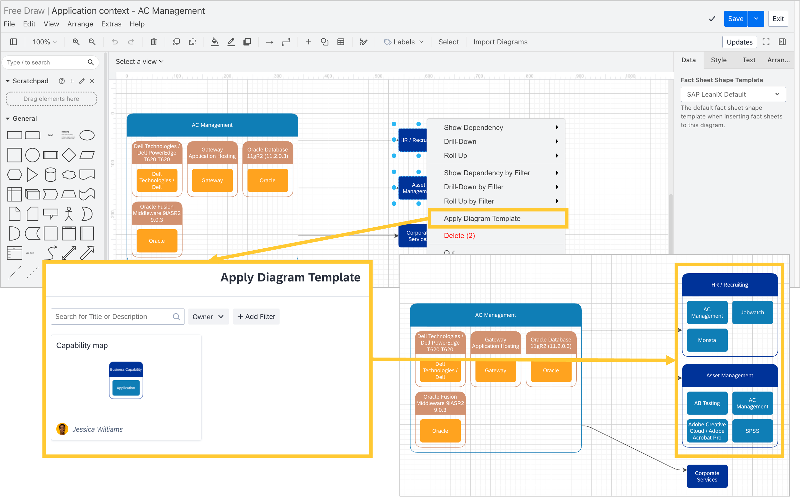 You can now apply diagram templates directly within the free draw diagrams canvas. Select up to five fact sheets of the same type, open the context menu, and choose a template to generate a structured diagram from your selection. This brings the convenience of templates into the flexible free draw canvas, helping you create consistent visualizations faster.