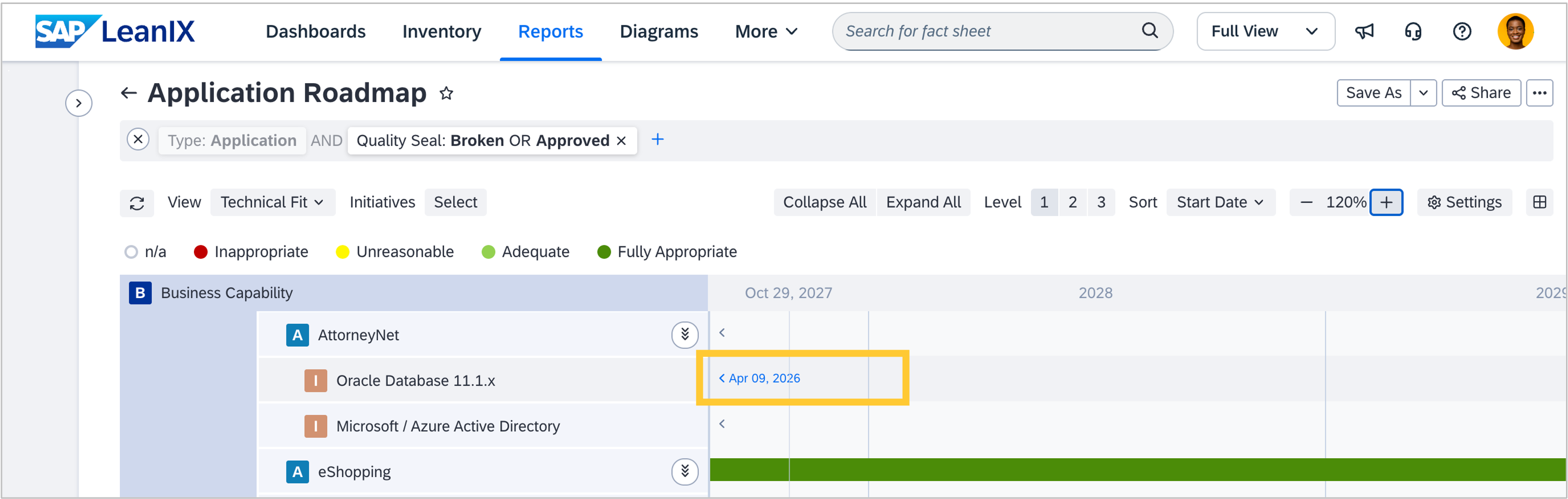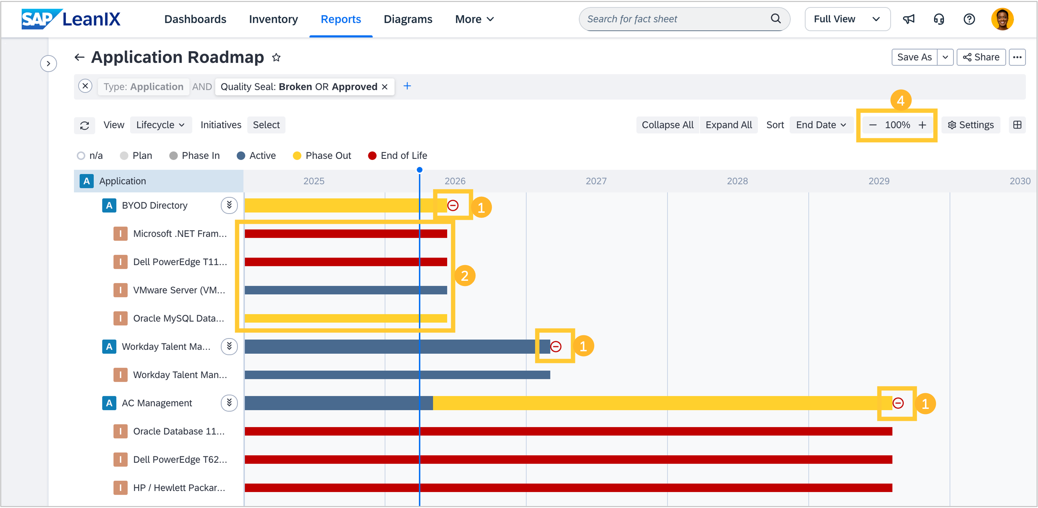 Consistent end-of-life display: Currently, end-of-life (EOL) dates on roadmap items appear as either an icon or a colored bar, depending on a report setting. With this release, EOL will consistently be displayed as a point-in-time icon across all roadmap items, and the bar-based display setting will be removed. Drill-down items, such as IT components shown within an application's lifecycle, will continue to show the EOL bar where it provides necessary context, for example, when a component reached EOL before the parent application became active. Please note: if you currently use the bar-based EOL display in saved report bookmarks, the display will automatically switch to the icon representation.